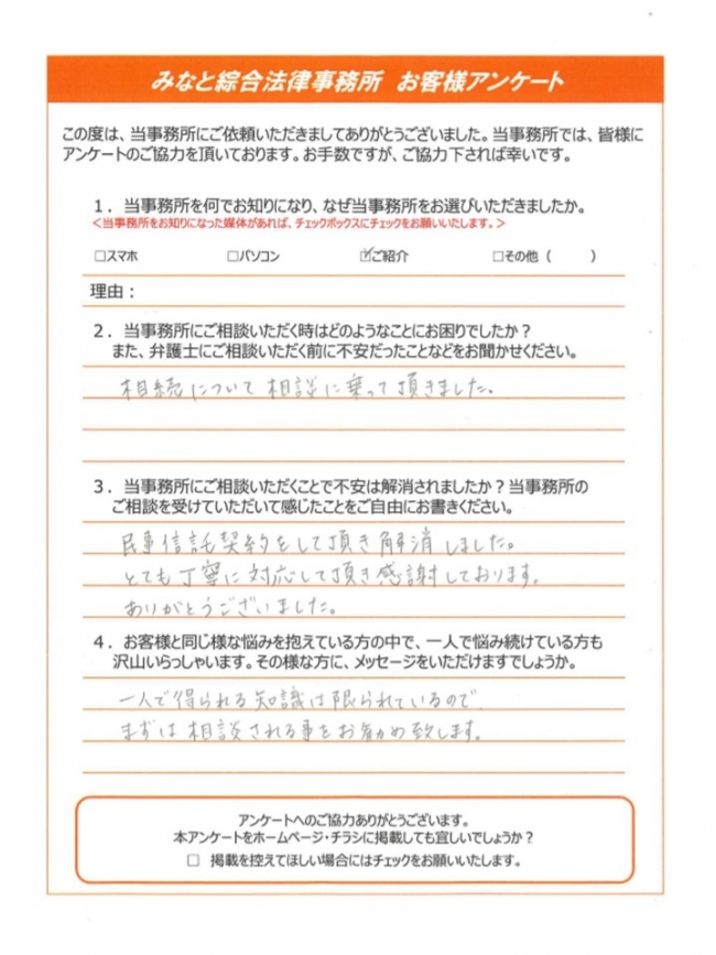 ⇒民事信託契約をして頂き解消しました。とても丁寧に対応していただき感謝しております。ありがとうございました。