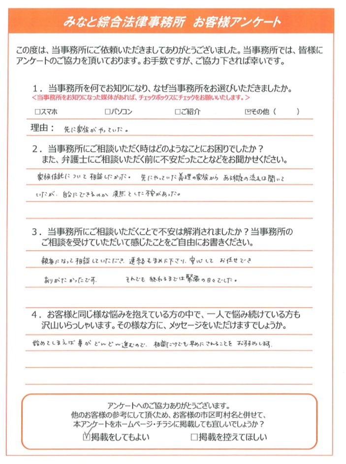 ⇒親身になって相談していただき、連絡もまめに下さり、安心してお任せできてありがたかったです。それでも終わるまでは緊張の日々でした。